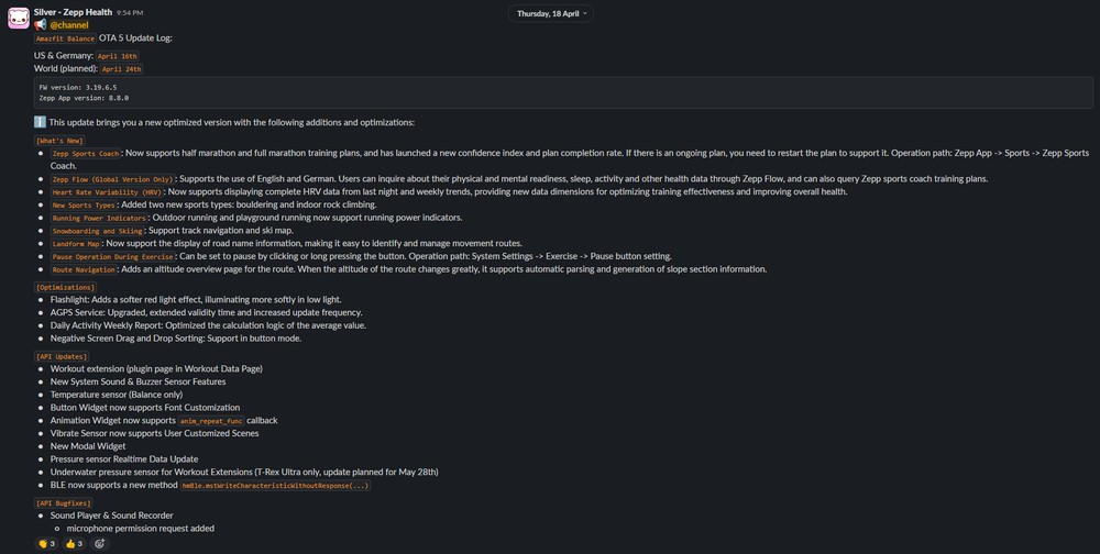 A empresa anunciou, por meio de uma postagem no Slack, que o smartwatch “Amazfit Balance” recebeu o firmware 3.19.6.5 através da atualização. O que pegou todos de surpresa, pois foi lançada antes do imaginado.