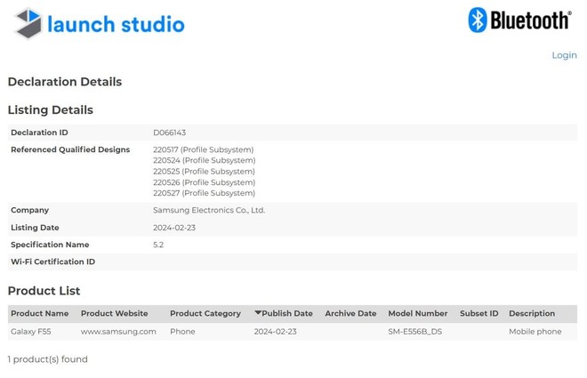 Segundo dados preliminares, o F55 conta com a numeração SM-E556_DS e traz Bluetooth 5.2 para conexão com diversos dispositivos e outros acessórios.