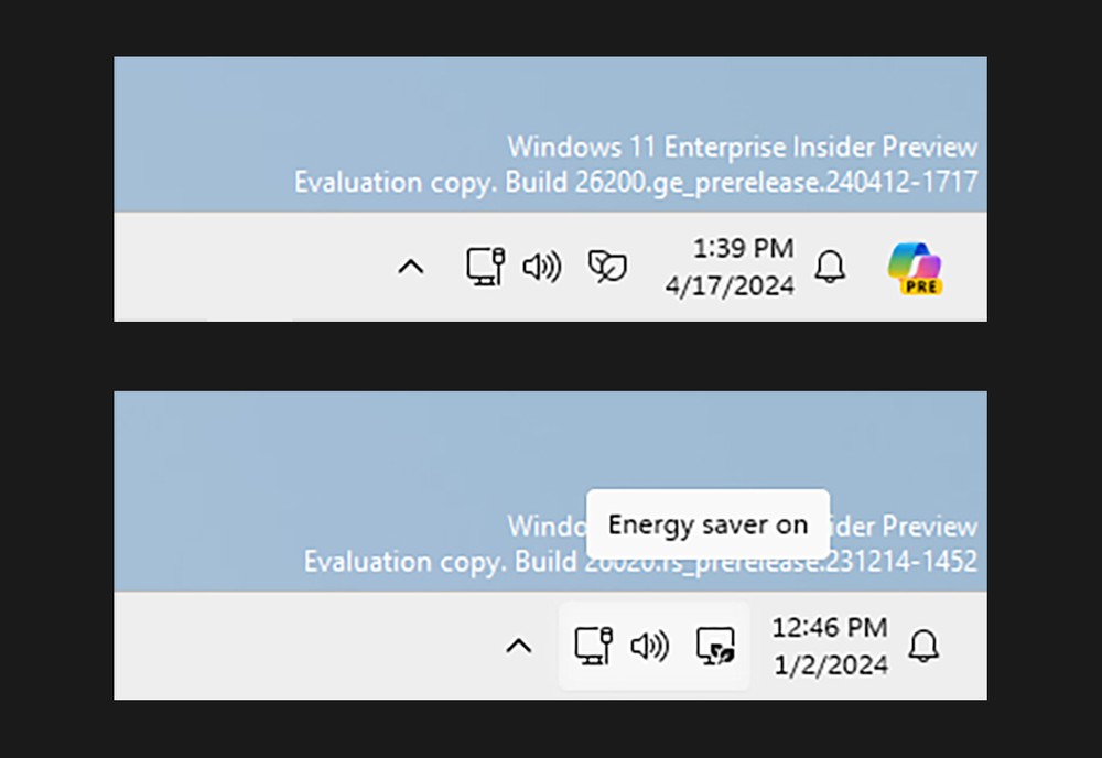 Outra mudança, embora discreta, é feita no ícone do modo de economia de energia em computadores que não possuem baterias — isto é, os desktops. A Microsoft chegou a testar uma nova figura que incluía uma tela com duas pequenas folhas, e agora, anuncia que está revertendo para o ícone original representado apenas por duas grandes folhas.
