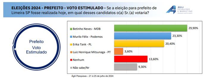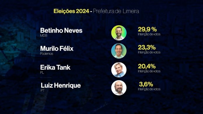 A mais recente pesquisa Todo Dia/Ágili sobre a intenção de voto para a eleição municipal em Limeira revela que Betinho Neves (MDB) está na liderança, com 29,9% das preferências. Em seguida, Murilo Félix (Podemos) aparece com 23,3%.