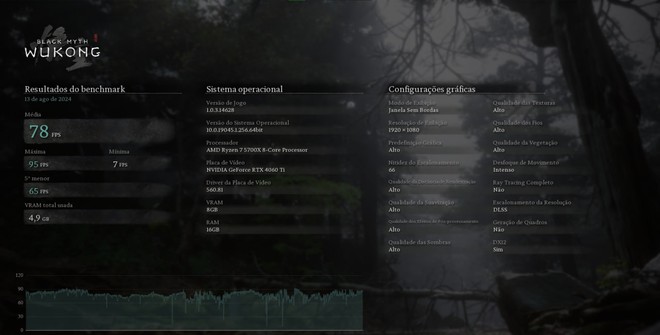 Após finalizado, esse teste entrega ao jogador uma análise de desempenho da sua máquina durante, com FPS mais alto, mais baixo e também qual será a média que ele terá no game se usar aquela configuração específica. Veja abaixo: