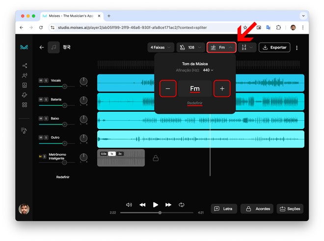• Se quiser voltar a música para o tom original, clique em “Redefinir”.